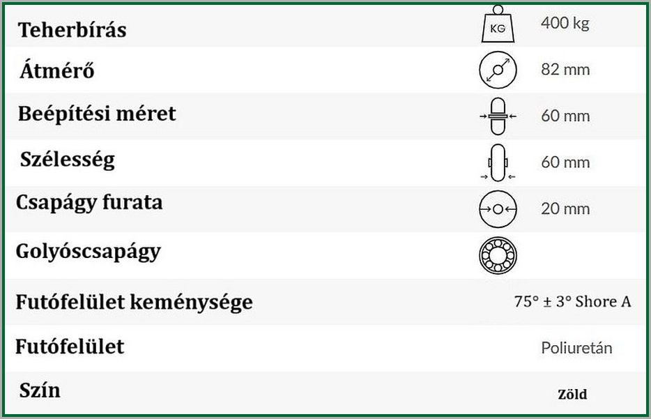 A raklapemelő görgő ( targonca görgő) lágy, rugalmas poliuretán futófelülete (75º ShA) biztosítja a maximális kényelmet, míg az öntött alumínium felni és a dupla golyóscsapágy garanciát ad a tartósságra és megbízhatóságra.