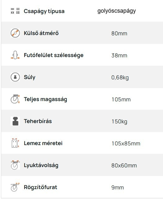 Kerék: Rugalmas, tömör fekete gumi, öntött alumínium felni, dupla golyóscsapágy